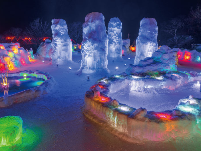 支笏湖の湖水をスプリンクラーで凍らせた大小様々な氷のオブジェが立ち並び、夜は色とりどりのライトに照らされ、幻想的な世界を演出します。メインの氷像は約10人の製作スタッフが2か月以上かけて作った力作で、近くで見ると迫力・美しさは抜群です。