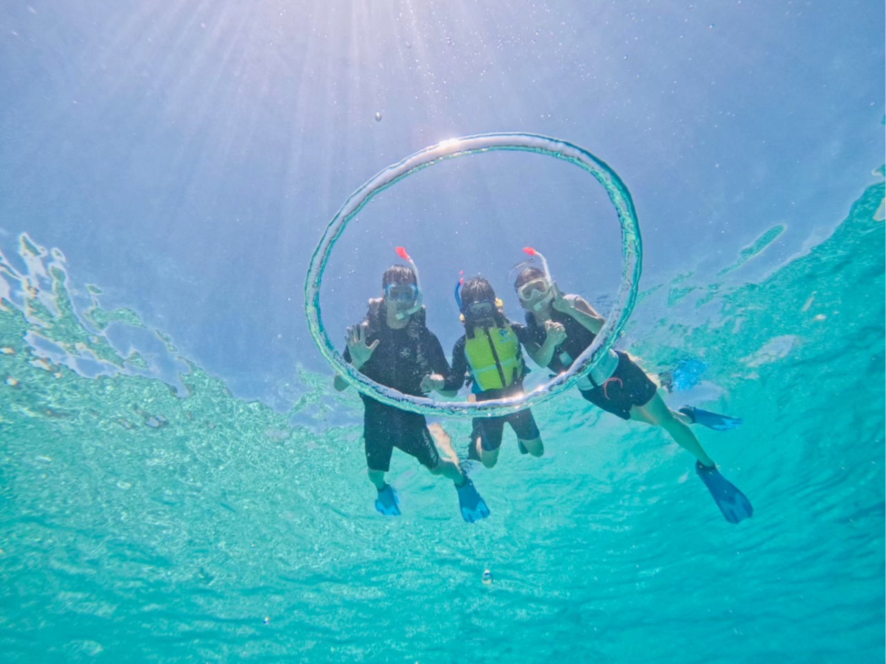 ガイドが必ずレスキューチューブを持ってご案内いたしますので、泳ぎに自信のない方や小さいお子様でも安心してご参加いただけます。シュノーケリング・ボートシュノーケル