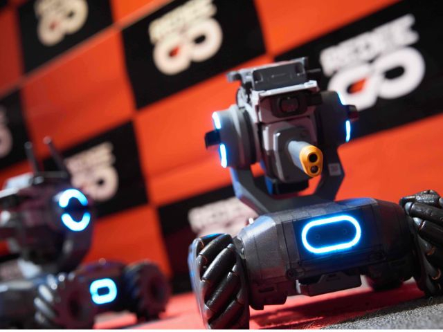 《陸上型ドローン体験》タブレットの操作で縦横無尽に移動できます。搭載したカメラで相手を認識し、対戦ゲームを楽しむこともできます。