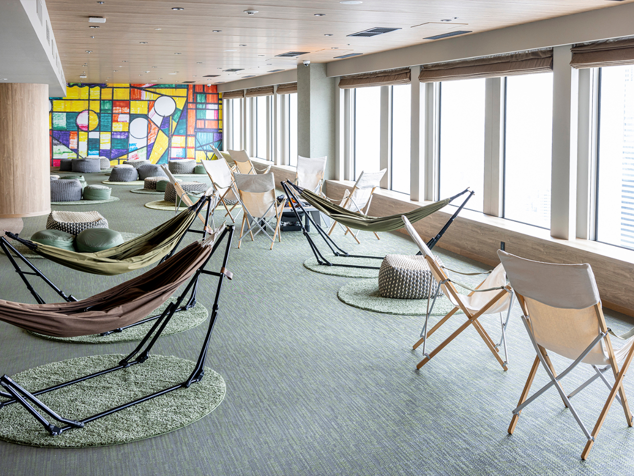 このほか、ハンモックやランタンなどを配置し、まるでアウトドアの雰囲気が味わえる「パーク」ゾーンや個室でのオンライン会議やカラオケなどを有料で利用できる「マルチパーパス」ゾーン、靴を脱いで自由に寛げる「ガーデン」ゾーンで構成されています。
