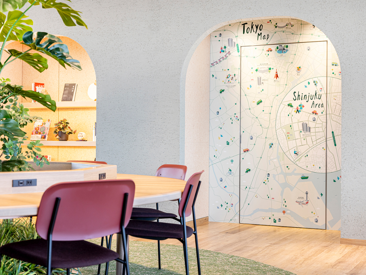 「ライブラリー」ゾーンは、電源や USB ポートを備えた席を多く揃えており、ワーキング利用にもおすすめです。また、このゾーンには新宿を中心とした東京の観光グラフィックマップが設置され、ホテルスタッフのおすすめ情報やお客様が実際に足を運んだローカルスポットなどの情報交換ができ、ガイドブックだけでは伝わらない最新のディープな東京観光案内が楽しめます。