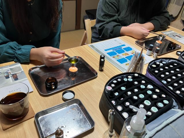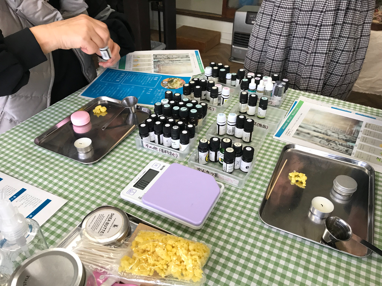 北海道産みつろうとキャリアオイルを溶かしたクリームに約70種類からお好きな香りを選んで作れます。
