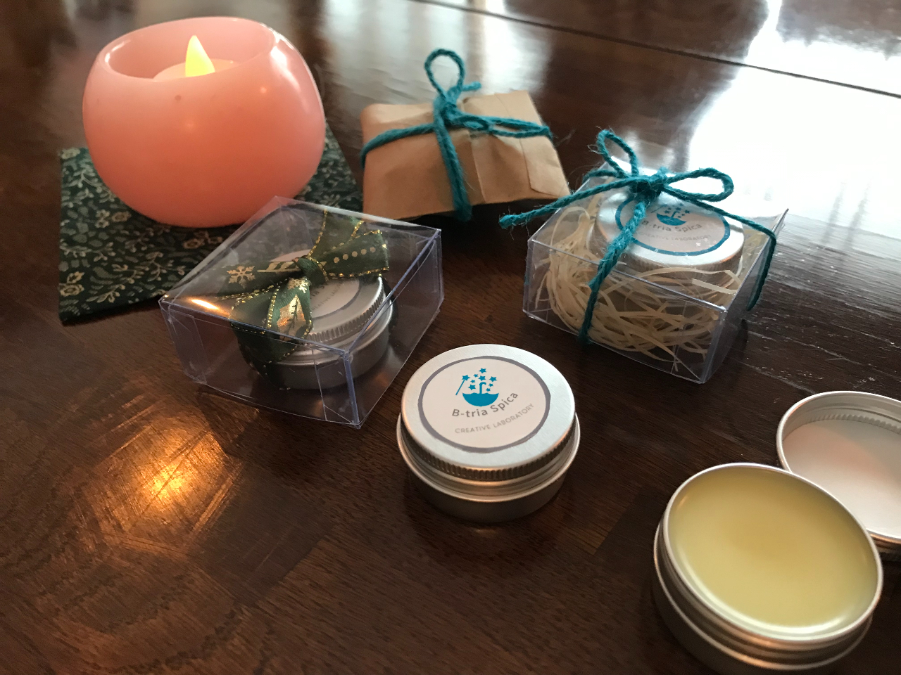北海道産みつろうとキャリアオイルを溶かしたクリームに約70種類からお好きな香りを選んで作れます。