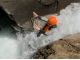 ロープとハーネスで安全を確保し、仲間の声援や助け合いを力に変えて激しく流れる滝に挑みます!