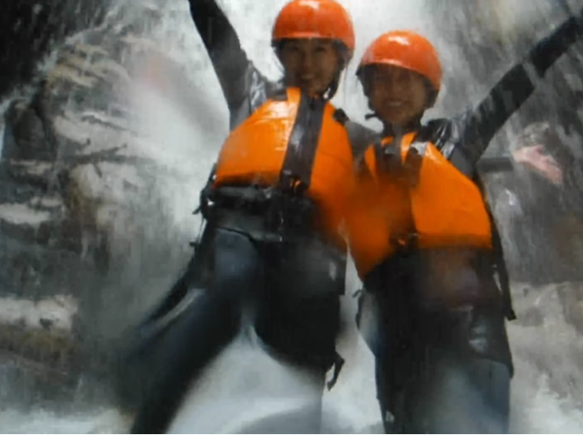 ロープとハーネスで安全を確保し、仲間の声援や助け合いを力に変えて激しく流れる滝に挑みます!