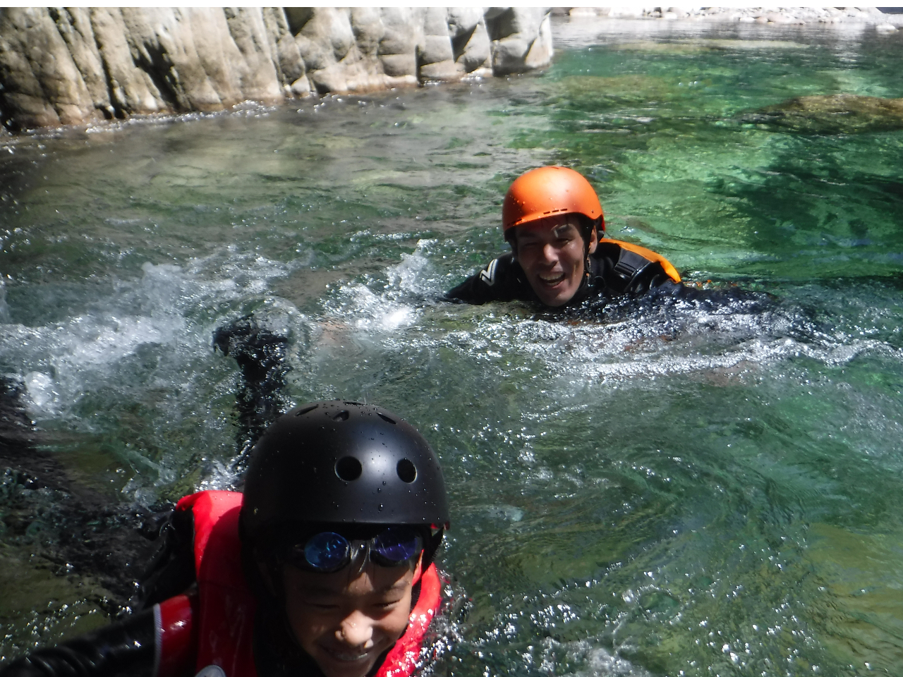 天然のウォータースライダーやエメラルドグリーンに透き通る水面への飛び込み等、自然の地形を活かした遊びを楽しみながらゴールを目指します!沢下り(キャニオニング)
