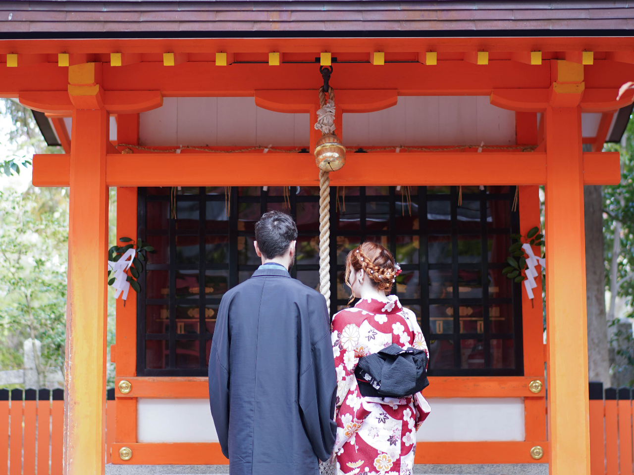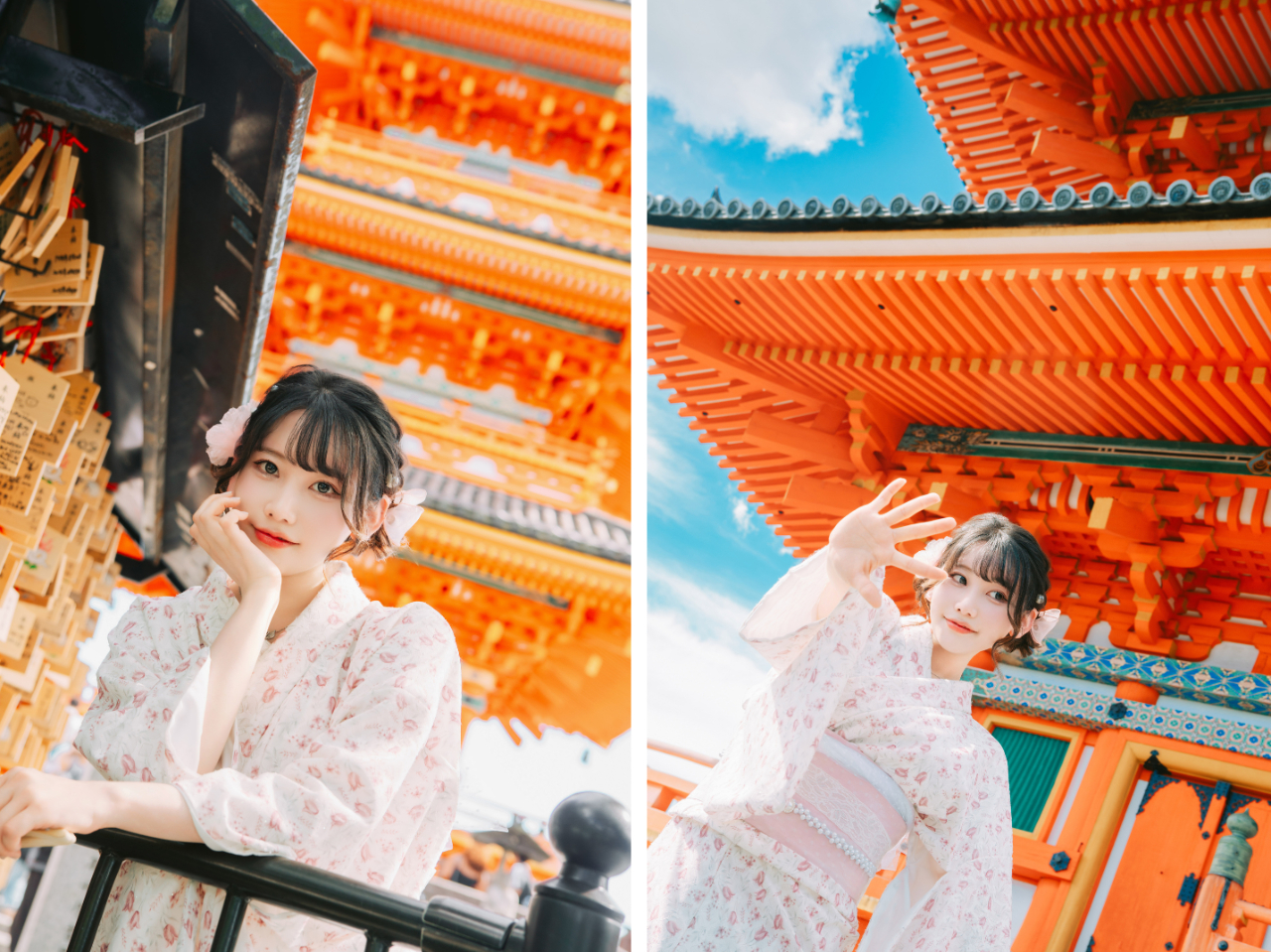 清水寺は京都を代表する名所であり、清水の舞台から望む景色は圧巻です。春の桜や秋の紅葉の時期には特に美しく、四季折々の風景とともに着物姿を写真に収めることができます。