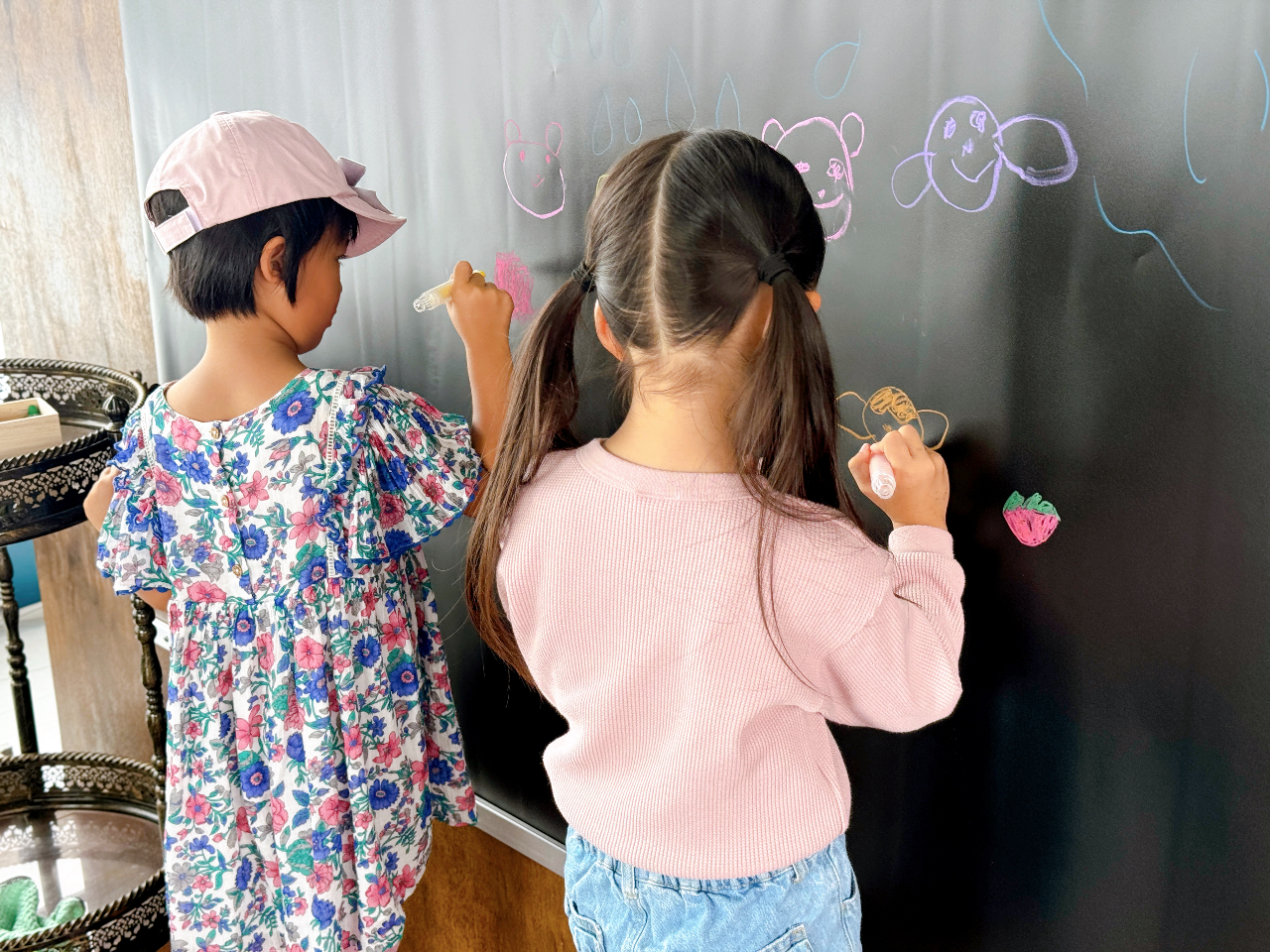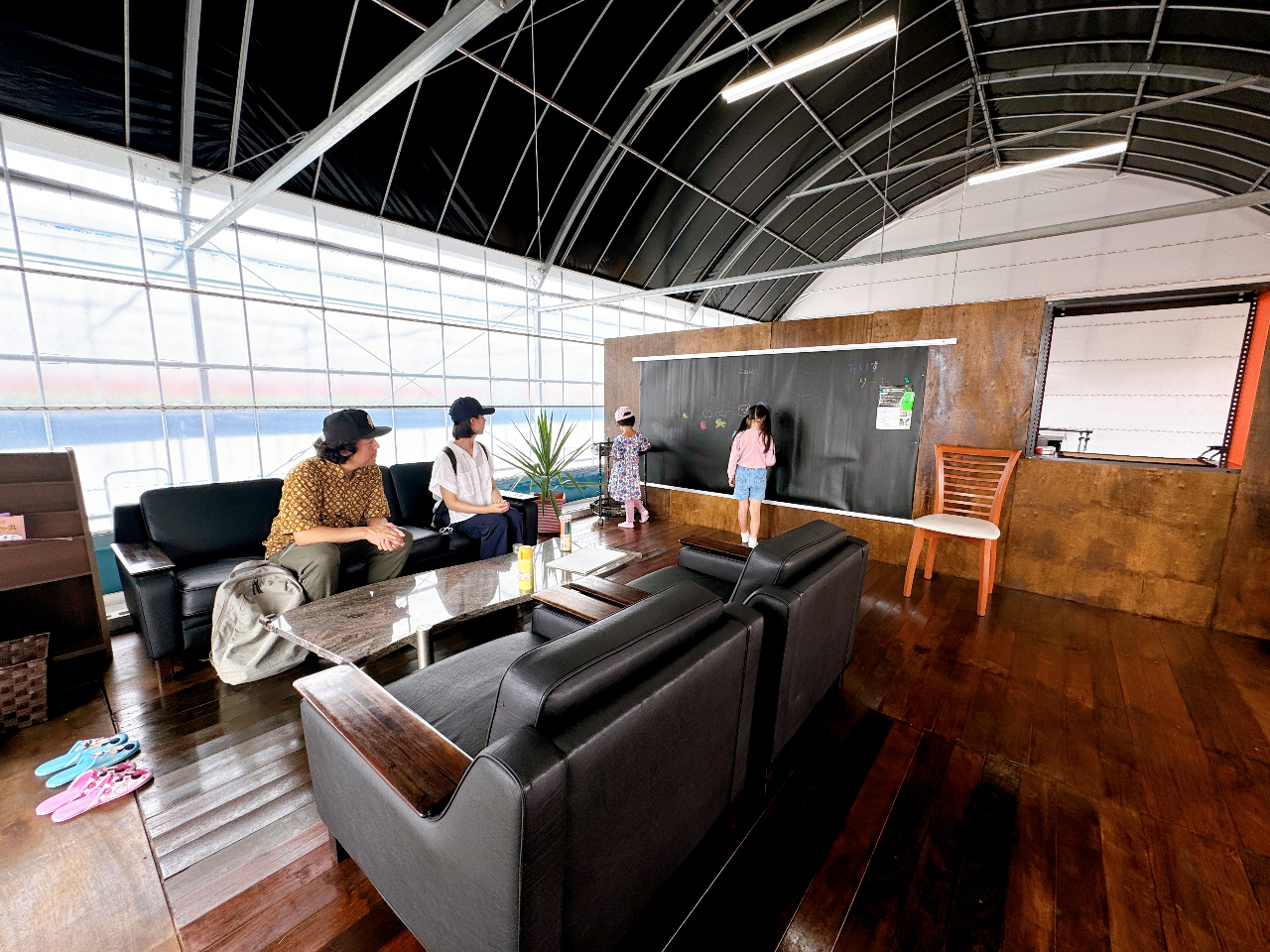 取ったいちごを休憩スペースで食べることもできます。お子様の落書きコーナーも設置。