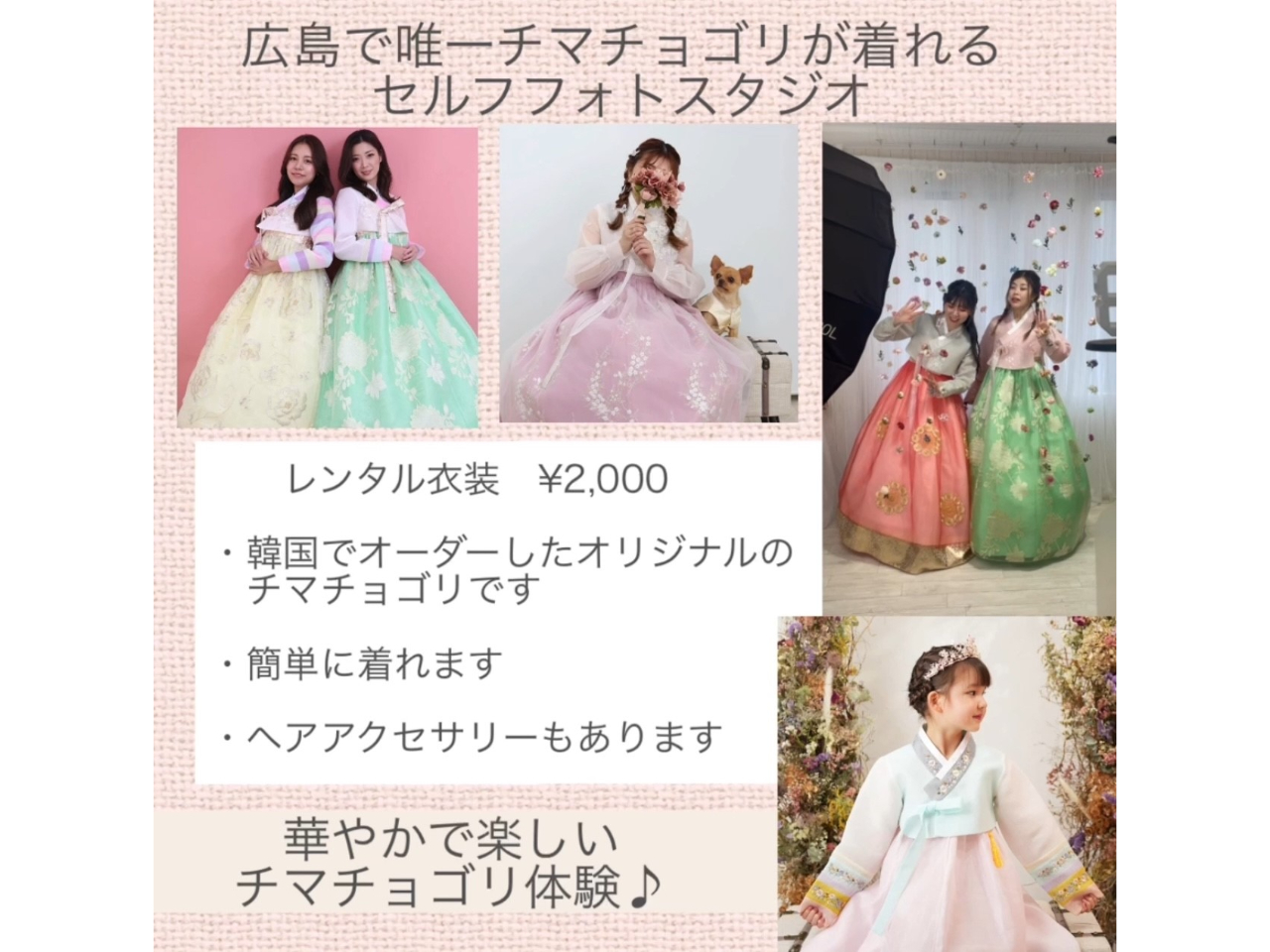 | 体験場所 | 広島県広島市中区南竹屋町6-20メゾン南竹屋1F セルフフォトスタジオAnniversary! |