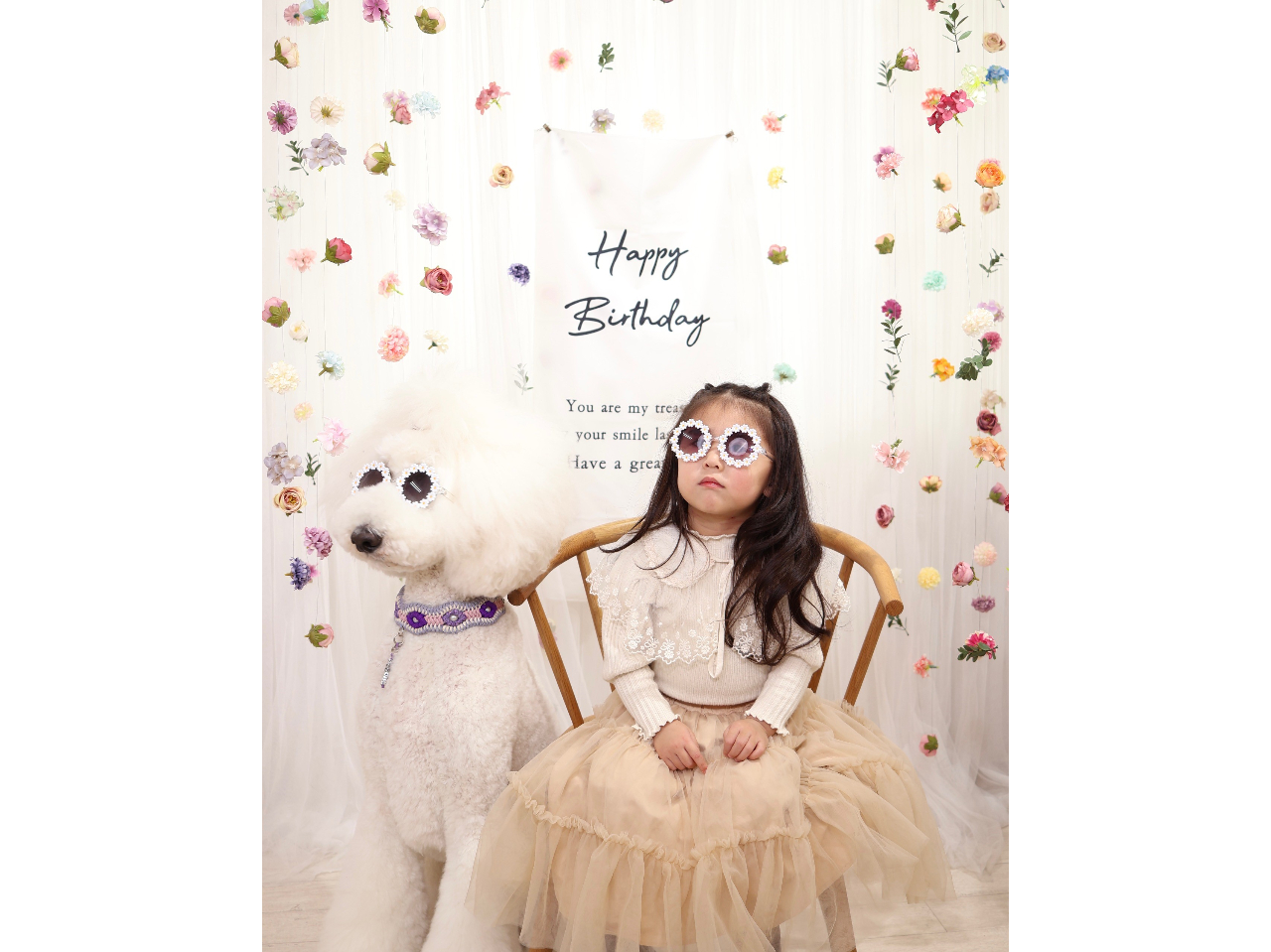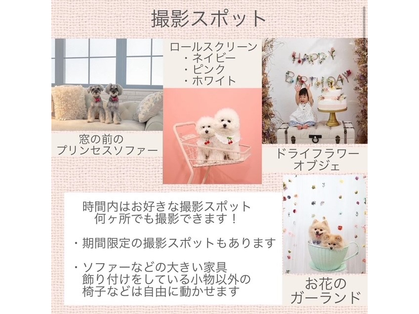 華やかで「カワイイ」がたくさんの店内で、ペット用の撮影小物などを使いながらセルフ写真を1組限定の完全予約制で人目を気にせず楽しめるお店です。ご家族、お友達との記念撮影はもちろん、なんでもない日もお気軽にどうぞ!