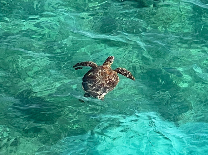 ☆ 浅瀬の車寄せでは、運が良ければ海亀に会えるよ!海の中に50cm〜1mくらいのゆらゆらした岩のような塊が見えたら、それは海亀かも?