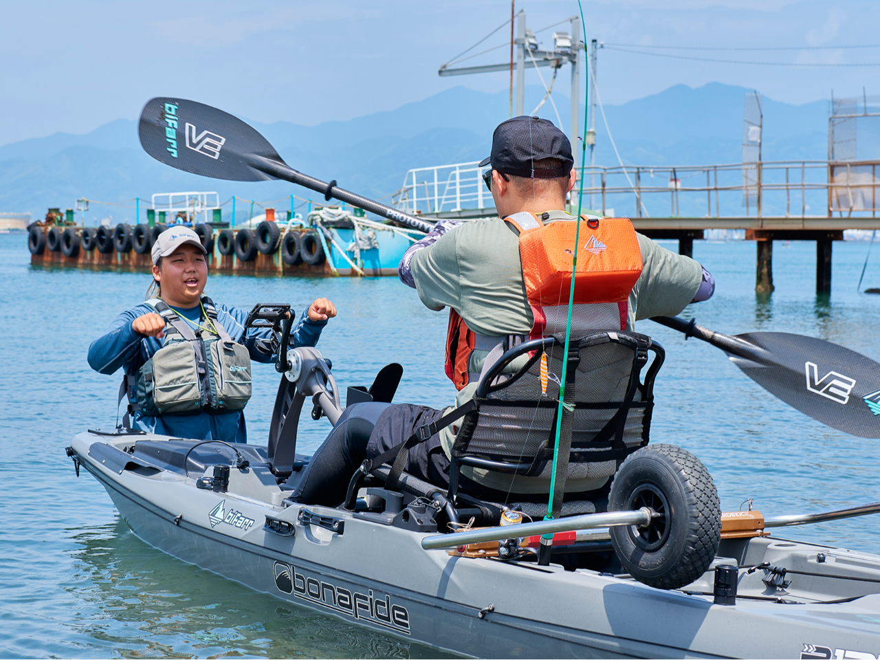 富士山をバックに、カヤックに載りながら釣りの体験を行うプランです。