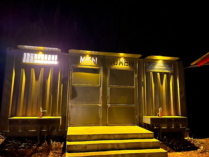 芝生のキャンプサイトには、コンテナを活用した洗練されたトイレ、シャワー室、