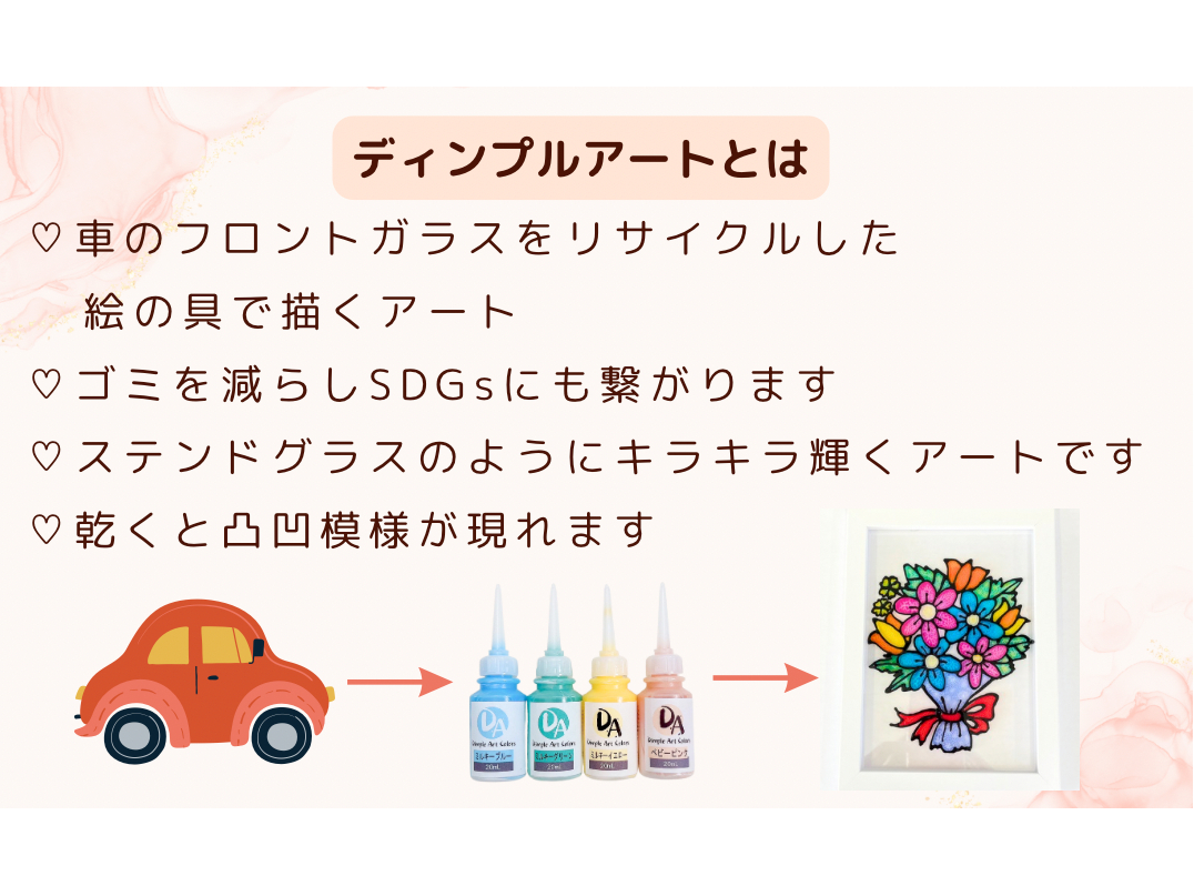 ディンプルアートとは、車のフロントガラスの廃材から出来た絵具を使うリサイクルアートです。