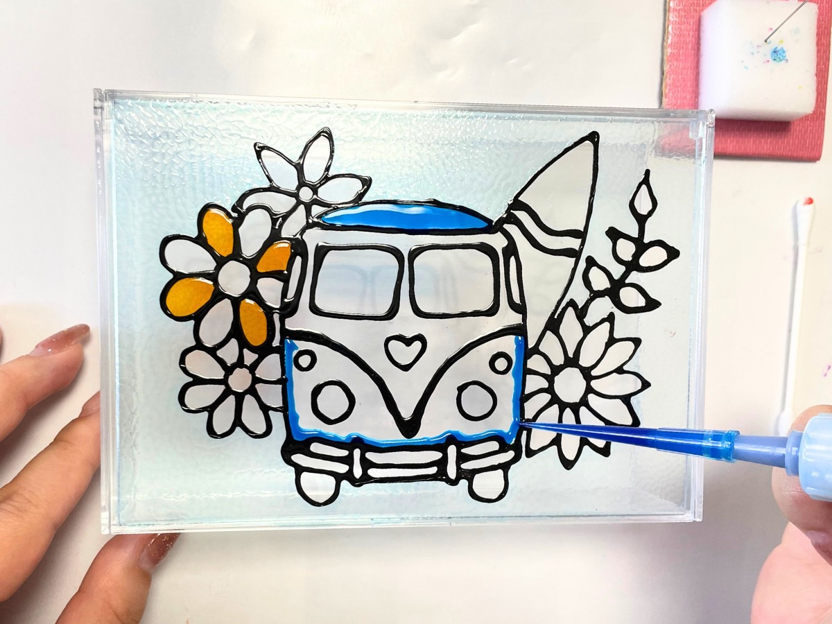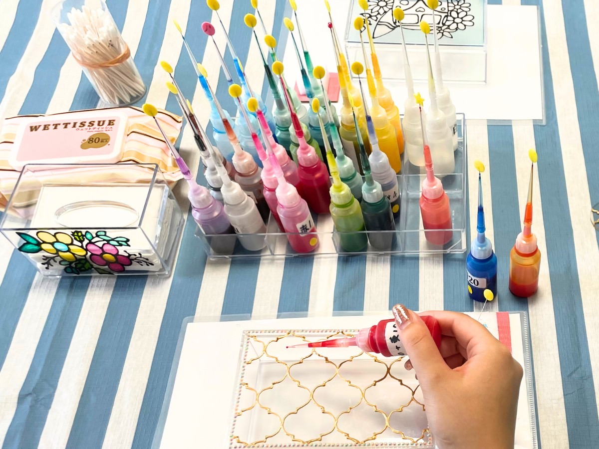 透明プレートに下絵が描いてありますので、そこにお好きな色で塗っていただきます。グラデーションや色の塗り方のコツ、やり直し方法など丁寧にお伝えしていますので、初めての方でも安心してご参加いただけます。