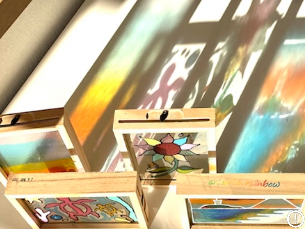 仕上がりはステンドグラスの様にキラキラと美しいです。地球を守るリサイクルアートを楽しく体験しませんか。