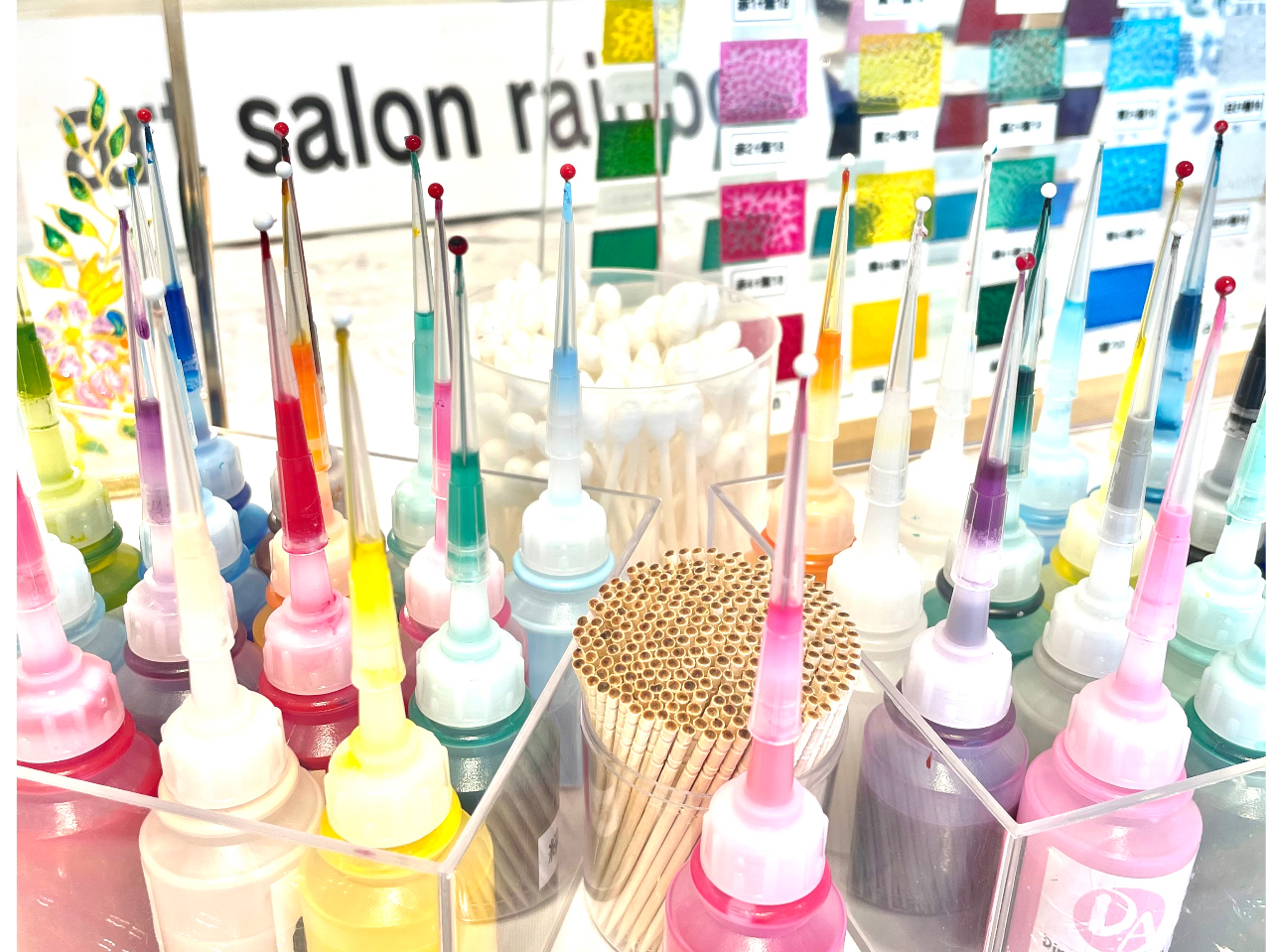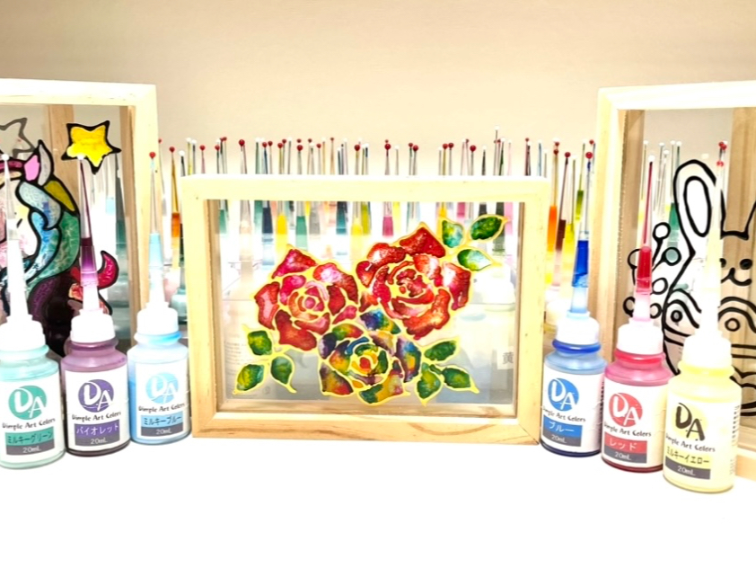ハガキ大の透明プレートに下絵が描いてありますので、そこにお好きな色で塗っていただきます。グラデーションや色の塗り方のコツ、やり直し方法など丁寧にお伝えしていますので、初めての方でも安心してご参加いただけます。