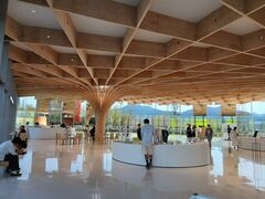 エントランス棟に入るとキノコのように持ち上がる柱や天井の意匠に思わず「うわっ!」と声をあげてしまいました。ガラスの向こうには瀬戸内海が広がります。