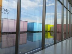 水面に浮かぶカラフルな箱型の部屋は可動式になっています。「被爆80年特別企画HIROSIMA2045−過去と現在を未来に繋ぐ」が開催されていました。
