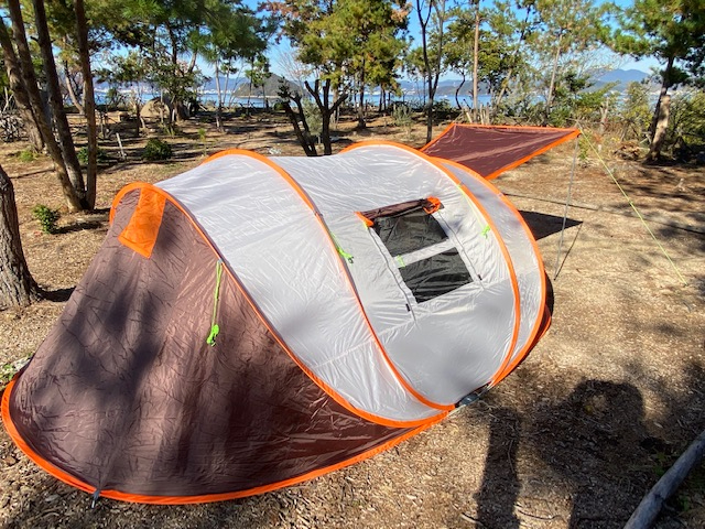 木陰を確保したキャンプサイト。この先に瀬戸内海の眺望と、夕刻以降は広島湾の夜景が拡がります。