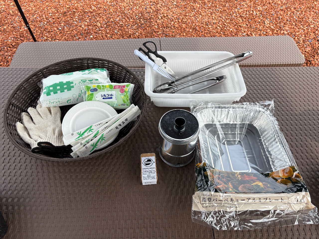 BBQプランには机・イスセット・タープ・BBQグリル(炭・着火済)・トング2本・ナイフ・カッティングボード・紙皿・割り箸がついています。