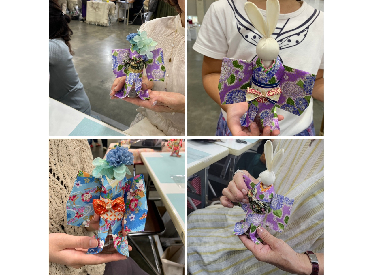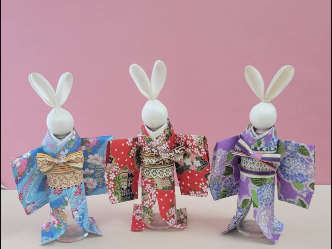 和紙で小さな人形にソラフラワーのうさぎさんをつけて愛らしい和紙人形ができます。外国のお友達へのプレゼント・おばあちゃんにプレゼントも喜ばれてます。和がお好きな方、うさぎさんが好きな方へ♪