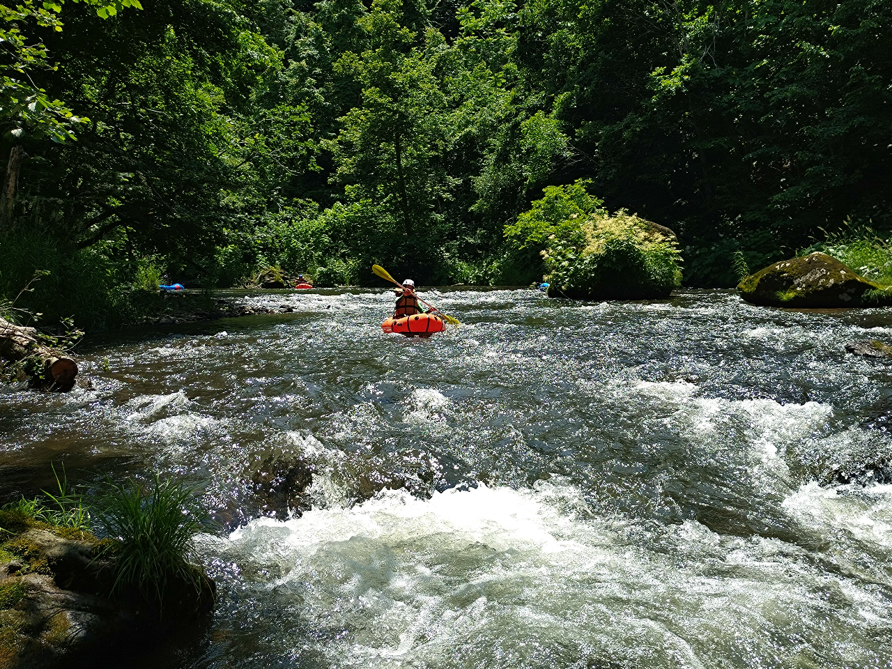 1人乗りのボートに乗り、自分で操船して川を下ります。