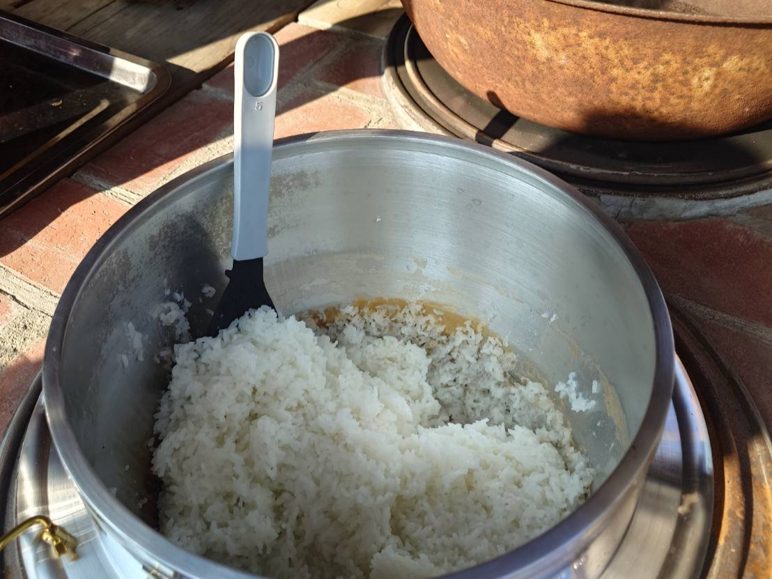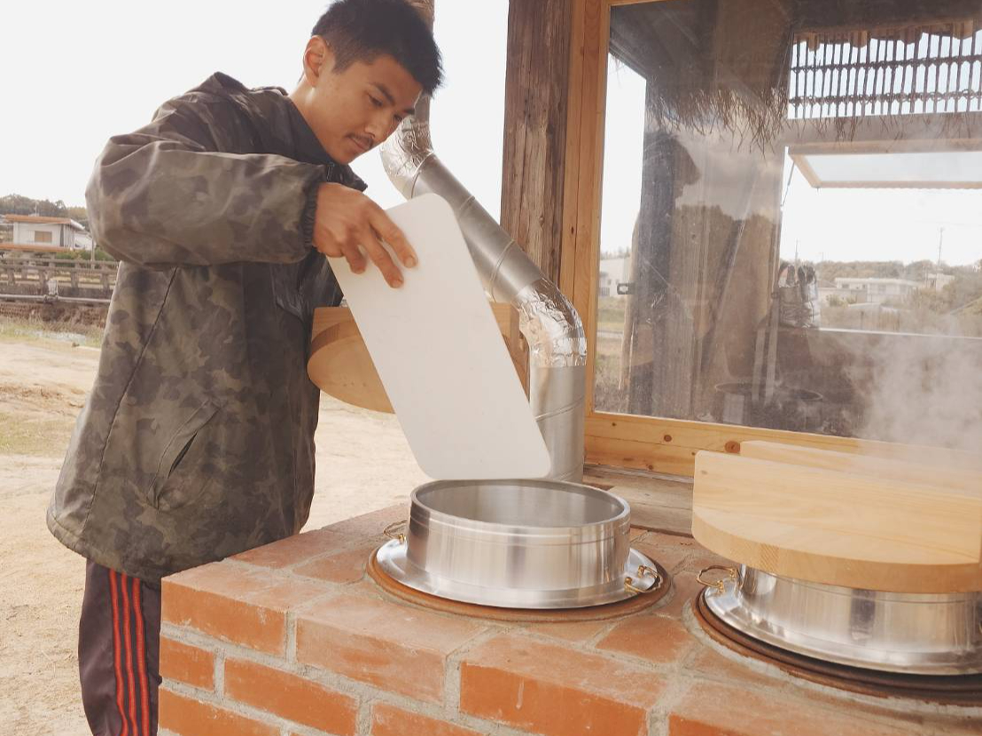 4.農園内にある釜戸で米炊きと収穫した野菜などを使ってお味噌汁を作ります。