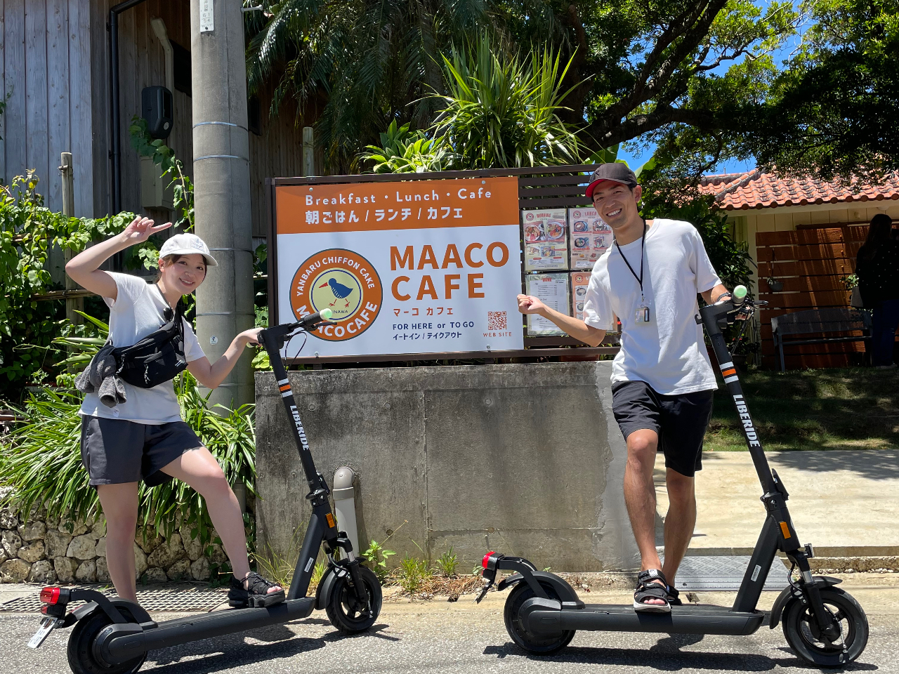 私たちMAACO CAFEは自然豊かな沖縄県北部「やんばる」地域の屋我地島という島にある南国ガーデンカフェです♪リラックスしたらめいいっぱい楽しんでほしいから、電動スクーター(キックボード)のレンタルを行っています!公道走行OKタイプなので車はカフェに置いておいて島探検に出発!屋我地島・古宇利島でやんばる旅のSOQ(Stay Of Quority)を高めます!!おすすめのコースもスタッフに遠慮なくご相談ください♪