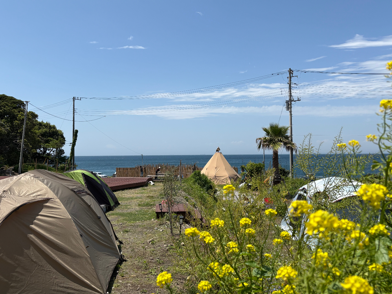 海は目の前!!ビッグなパノラマで鏡のように静かな美しい海(鏡ヶ浦)を望む、まさに特等席でのキャンプ!天気が良いクリアな日には海越しの富士山と美しい夕陽が望める最高のロケーションでのキャンプが楽しめます