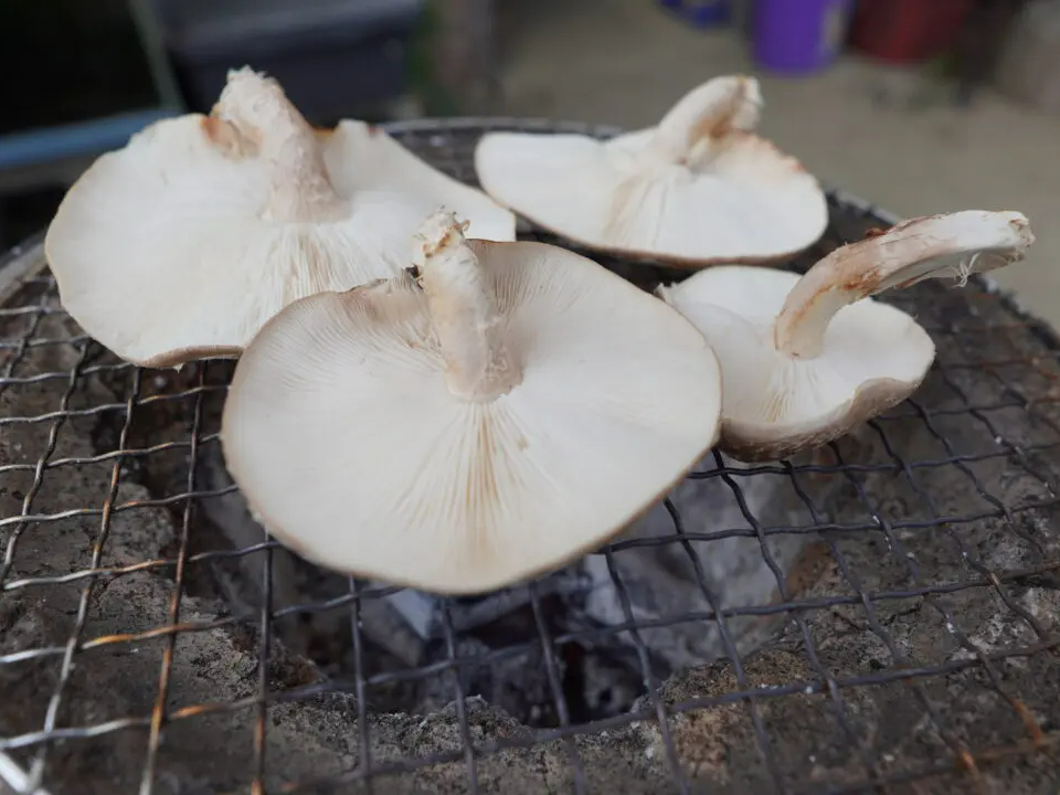 もぎたてしいたけを七輪の網の上で焼いてお召し上がりください。