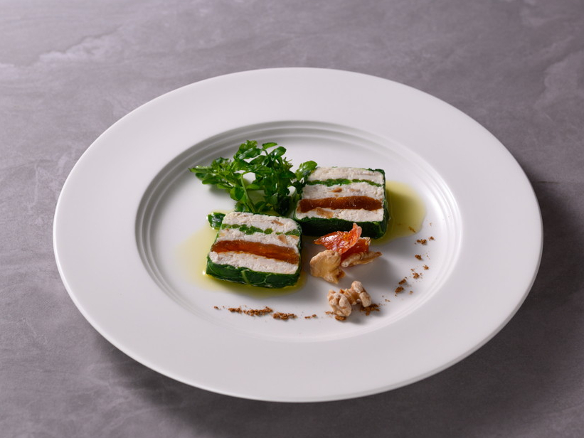 ・鶏と里芋のテリーヌ 干し柿とクルミ添え