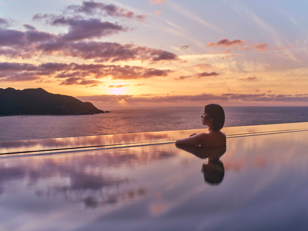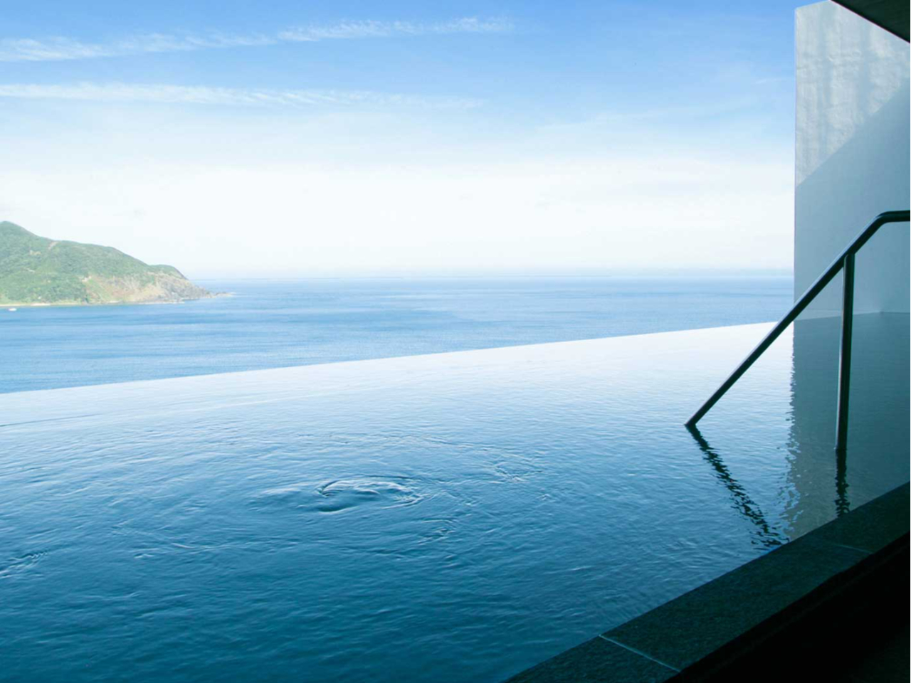 露天風呂では大きく切り開かれた屋根と、水平線にこぼれる水面が、ありのままの自然の魅力を最大限に引き立て、まるで一枚の美しいキャンバスに。