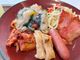 フルーツにはマスカットやライチでさっぱり、おかずは厚めのカリカリベーコン、ウインナーやふわふわスクランブルエッグなどの定番に加えて、焼きそばやエビ団子のクルトン揚げ、八宝菜、飲茶は3種がせいろで待っていました。