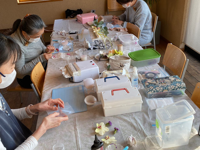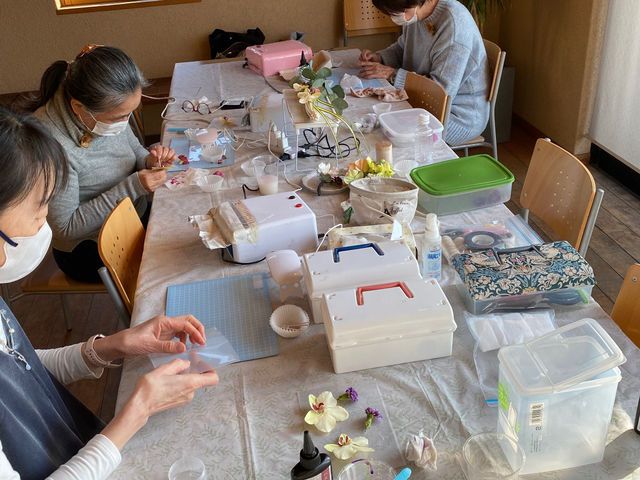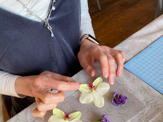 押し花やドライフラワー、身近な布素材を使って季節の花のアクセサリー(イヤリング、ペンダント、ブローチなど)や、プチアレンジが作れます。