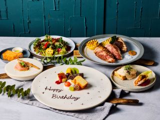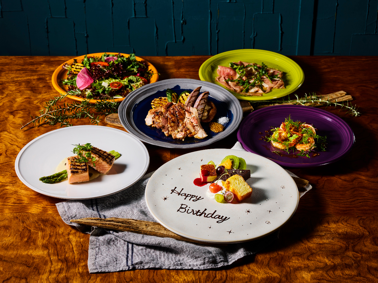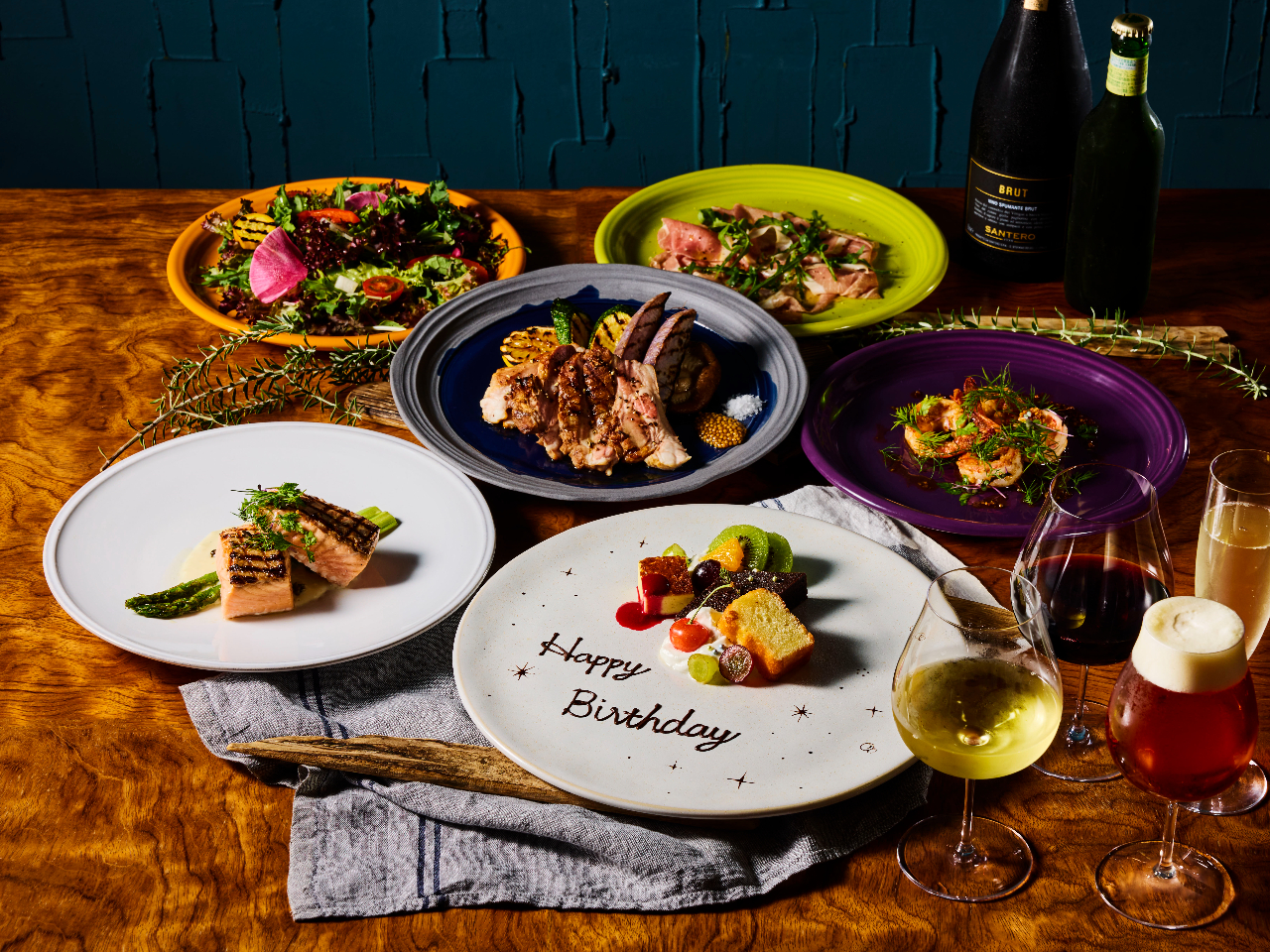 【記念日/誕生日に♪アニバーサリーコース+飲み放題150分】とろける食感のくちどけ加藤ポークとアトランティックサーモンのWメイン!メッセージプレート付き全6皿に飲み放題がついたお得なコース!