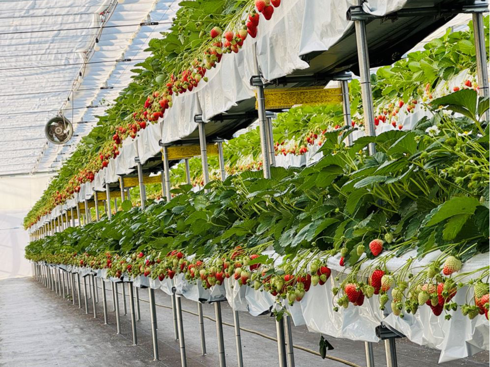 2段ベンチにして通路を広くしているので、小さなお子様やベビーカー・車いすでも楽しんでいただけるよう配置しております。多品種栽培にもチャレンジしておりますのでいろんないちごをお楽しみ下さい♪