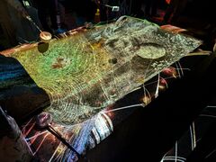 手水盤のプロジェクションマッピング。手水盤の中に錦鯉が泳ぎ、水面に紅葉が落ちると波紋が広がる演出。