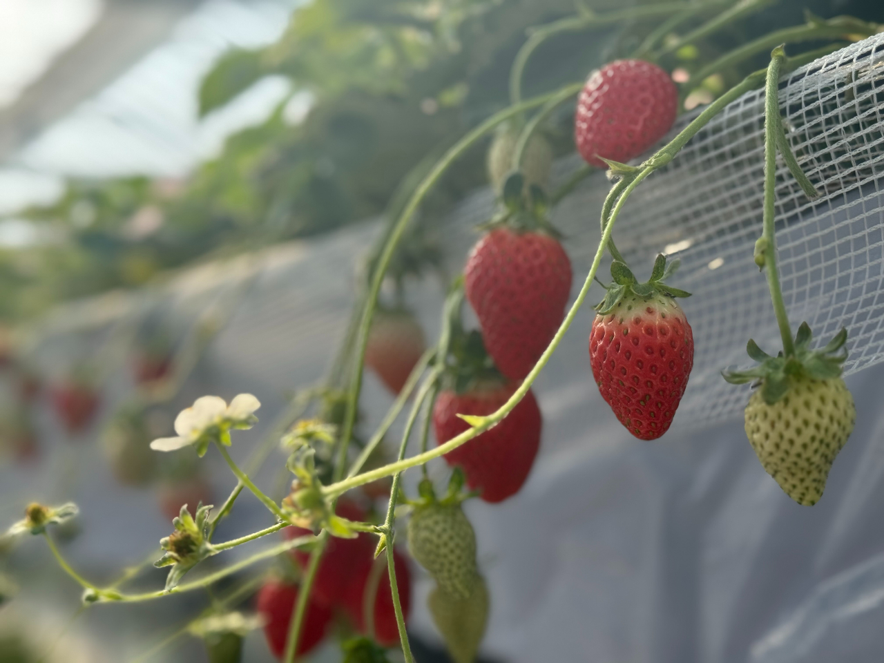 いちごの茎が垂れているので気をつけながら通りましょう。