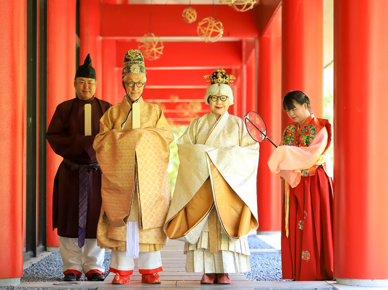 県内屈指のフォトスポット。朱色の回廊ではお二人を黄金に彩ります。