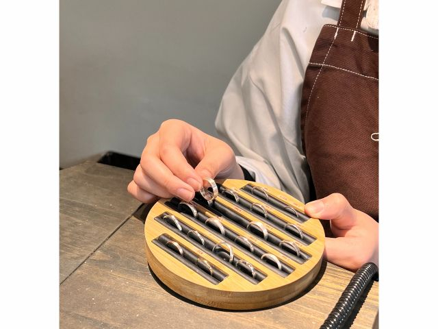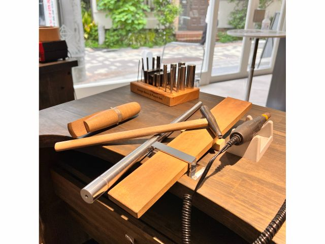 一日でご自身で完成させるので、シンプルな形ではありますがデパートで売っているものとは違う、鍛造方式の強い指輪でなおかつこだわりの入ったものができます。 製作に入る前に打ち合わせをさせていただきます。