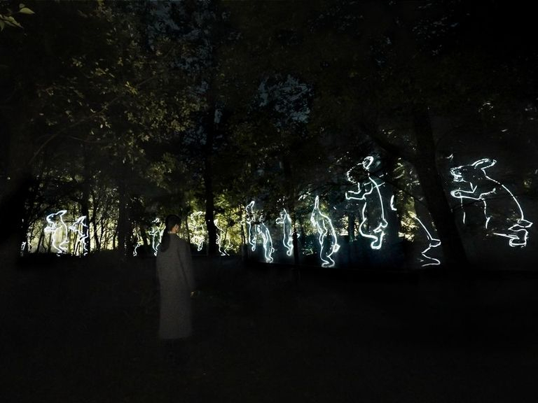 森に憑依する炎 - 二次林 /《Distributed Fire》のアプリを持って作品の炎に近づくと、スマートフォンに炎がともり、作品を持ち帰ることができる。