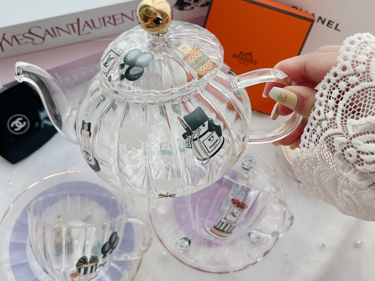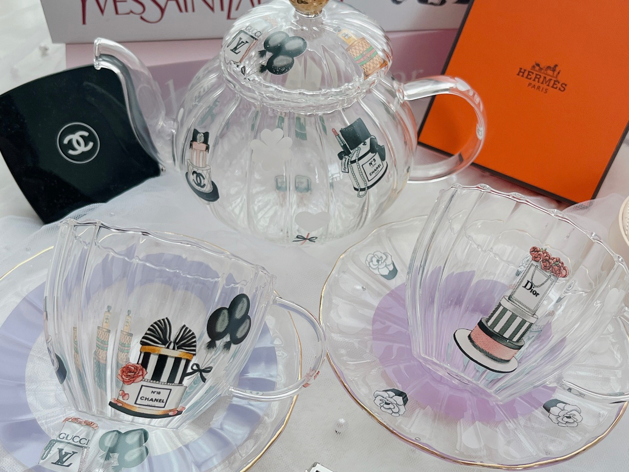 ガラスのティーポットとカップ&ソーサーのセットになります。