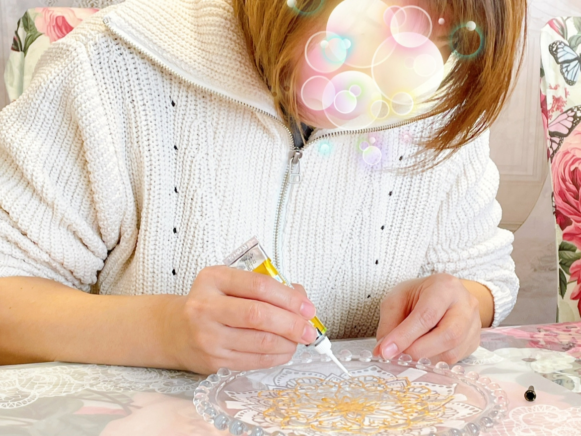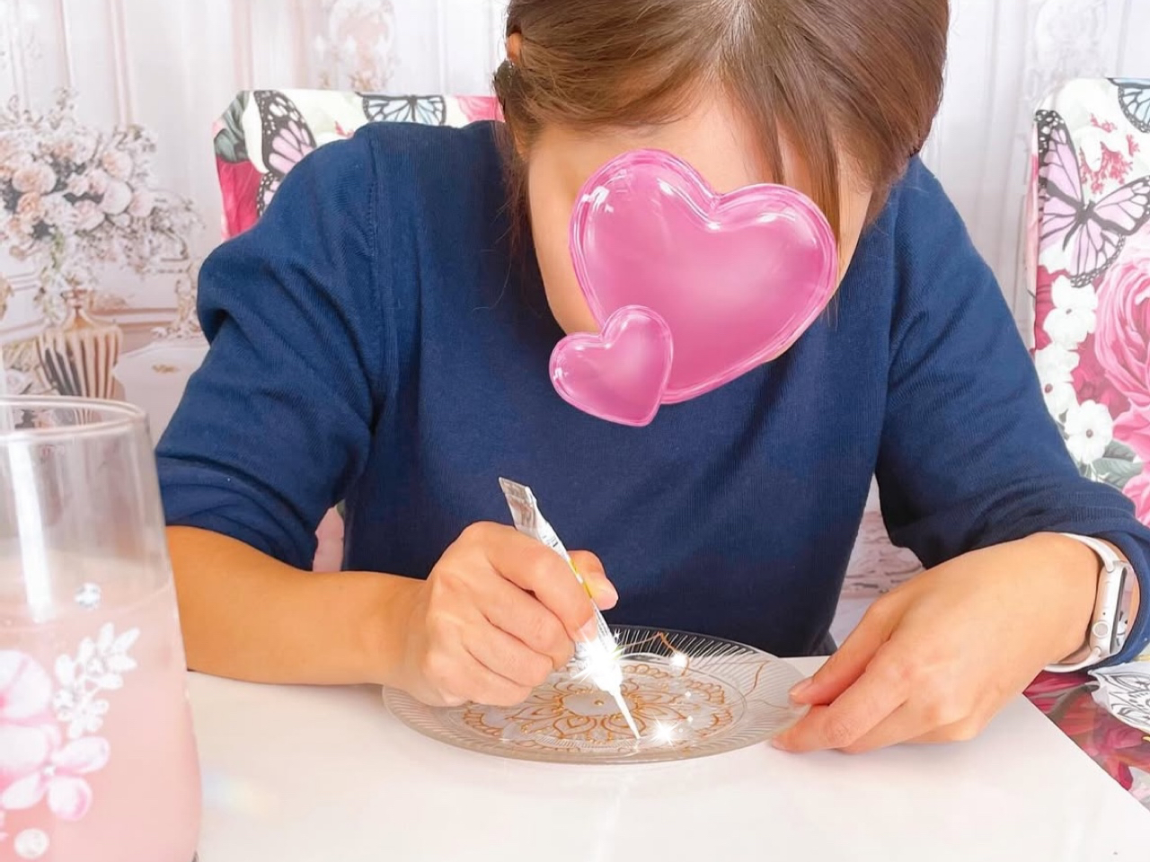 〇ぷっくり描ける特殊なゴールドのペンで華やかな絵柄をガラス皿に描きます。