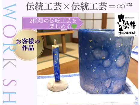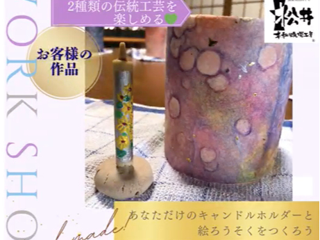 伝統工芸品和ろうそくにぴったりなキャンドルホルダーの制作と和ろうそくに絵付けのセット体験。ご自宅に持ち帰った後は、炎を灯し、揺らぎを感じながら癒しの時間を過ごしていただきます。