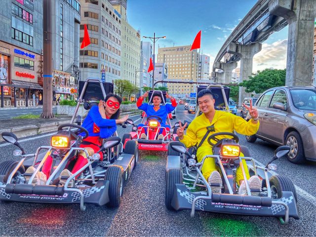 ★ツアー ガイドがゴーカートの運転方法を説明し、ご希望であれば、用意されたコスチュームを着て国際通りのヒーローになり目立つこともできます。