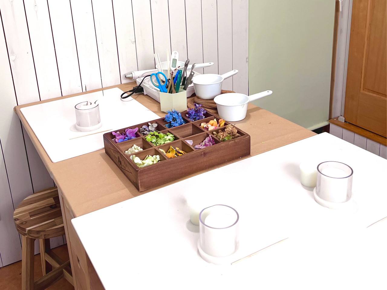 アトリエで制作しているドライフラワーを選んでいただき、オンリーワンキャンドルが初心者のかたも簡単に作ることができます。楽しいひと時にしましょう!