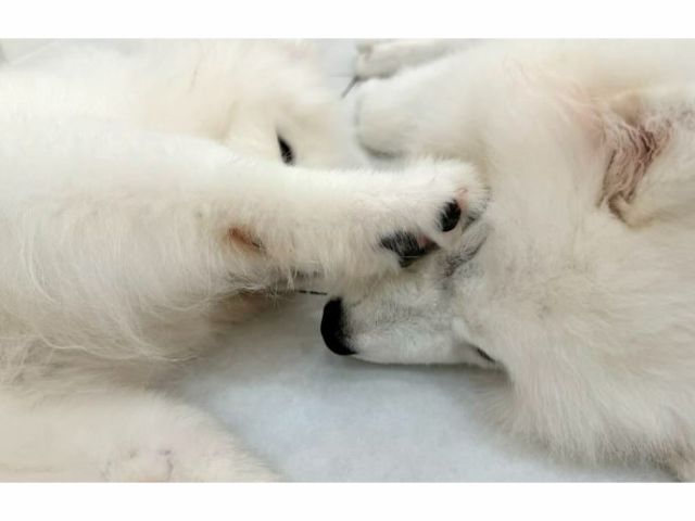 すっかり友達になったサモエドを見つめるあなたの顔も