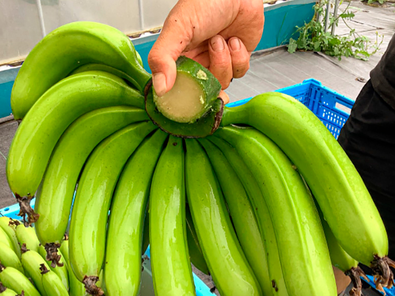 ◎まえばしバナナは、皮ごと食べられる高級品種の“グロスミシェル”。