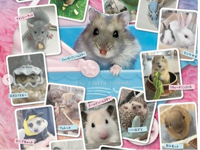 マイクロブタ・ミーアキャット・フェレット・ハリネズミ・モモンガ・インコ・チンチラ…などなど様々な動物たちと触れ合うことができます。
